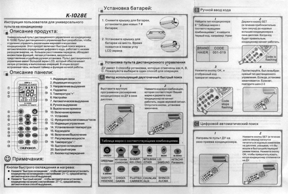 Универсальный пульт дистанционного управления сплит-системой K-1028E подходит практически для всех видов бытовых кондиционеров.
